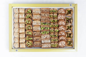 Das gemischte Sortiment beinhaltet die Sorten • Mabroumeh Pistazien • Mabroumeh Cashew • Baklava Pistazien • Baklava Cashew • Baklava Walnuss • Basmeh Pistazien • Basmeh Cashew • Basmeh Walnuss • Asabia Pistazien • Asabia Cashew • Sorrah Pistazien • Kol wa Schkor Cashew