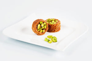 Mabroumeh Pistazien hat den größten Nussanteil und ist daher eine der beliebtesten Sorten in der arabischen Patisserie. Die naturbelassenen Pistazien werden in einem von uns hergestellten feinen Fadenteig eingerollt und anschließend in feinstem Ghee fettgebacken. Zum Schluss wird das Gebäck dezent gesüßt, sodass es geschmacklich dem Gaumen angepasst wird.