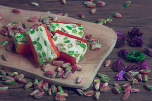 Nur die besten Zutaten werden für unseren leckeren Weißen Nougat benutzt, der mit Pistazien gemischt und mit Aprikosengelee ummantelt wird.