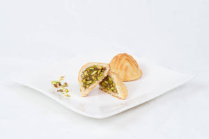 Maamoul Pistazien ist ein Mürbeteig-Gebäck mit Pistazienfüllung. Der rohe Mürbeteig wird per Hand mit gebrochenen Pistazien gefüllt, anschließend in eine Holzform gedrückt und herausgeklopft. Die Plätzchen werden bei einer sehr hohen Temperatur für kurze Zeit gebacken, sodass sie zart bleiben.